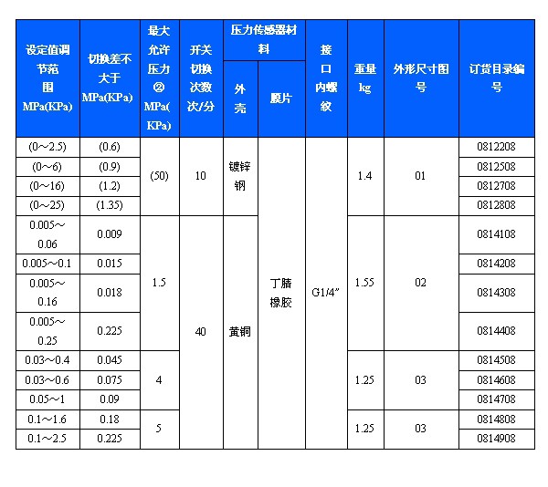简介:双触点压力开关采用膜片式传感器,可用于中性气体、液体介质。双触点压力开关的设定值可调,调节范围0~2.5MPa。主要技术性能:规格:切换差不可调